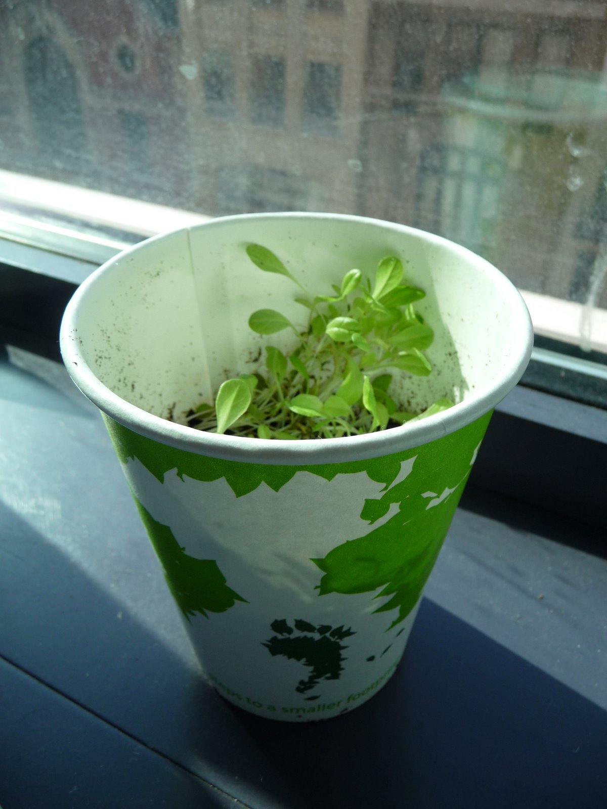 I am currently trying to reduce my footprint on the world by growing my own lettuce… at this rate, I’m going to starve to death. I acquired the supplies (i.e. seeds, soil, and a cup) to grow this lettuce at the New York Times’ Green Fair about a month ago. Since then, I’ve been plagued with the duty of watering it every day and making sure it’s in the sunlight.
