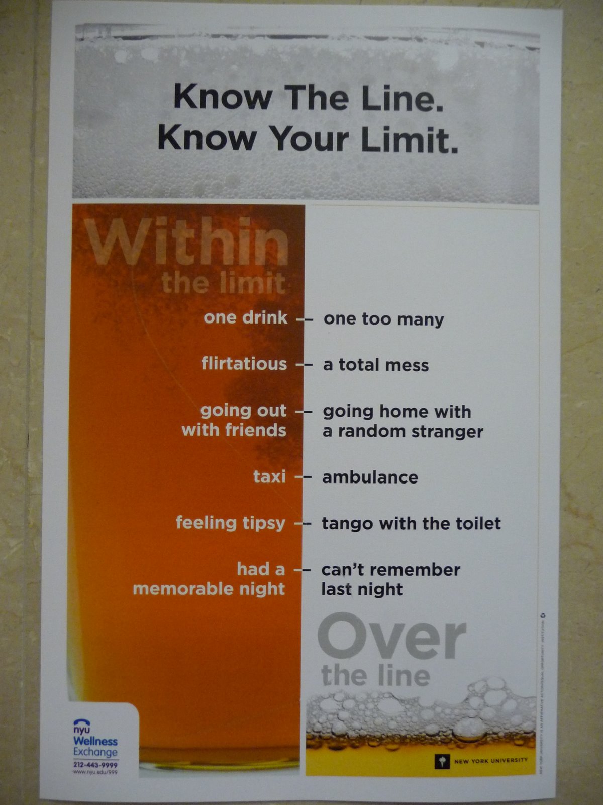 I just wanted to share the most recent NYU Wellness Exchange public service announcement encouraging students to know their limits on drinking alcohol. It’s interesting that they would try to spell it out for us… so, how much is too much? Well, according to this PSA, you’re over the line in you’ve gone from: