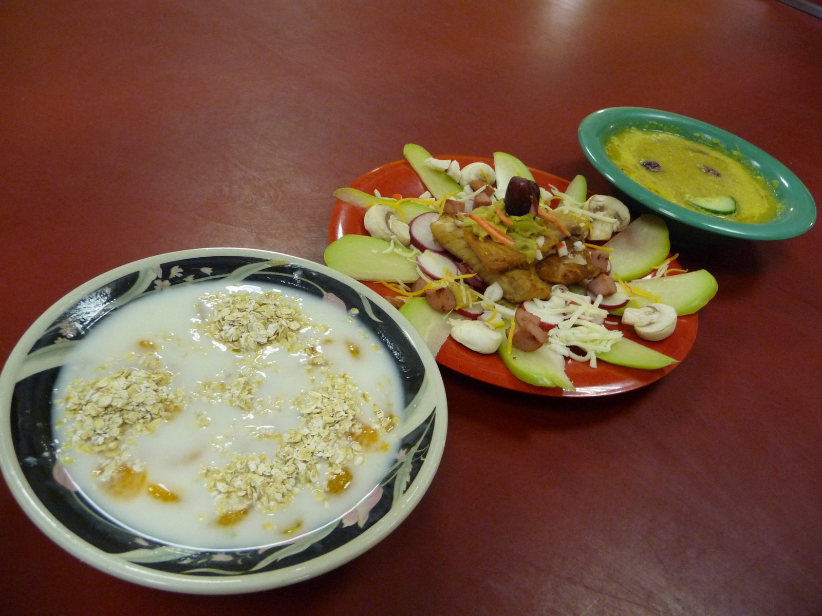 Dessert: Oatmeal and yogurt mixed with freeze-squeezed grape juice and tangerines