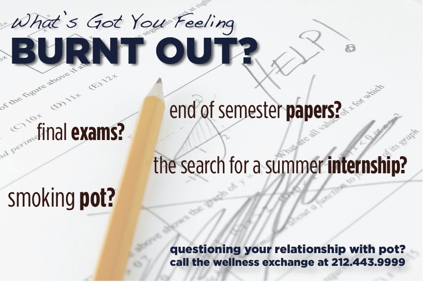 On April 20th I received another compelling email from the NYU Wellness Exchange, titled “Burnt out?”. Last time the Wellness Exchange sent out one of these emails it was about over-drinking. This time, on the national high holiday (4/20), it was only fitting for it to be about smoking pot. Read the image above, which was the body of the email.