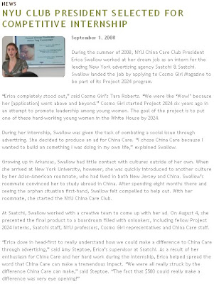 This week, China Care launched their newly designed website: www.chinacare.org. It is much more user friendly and explains in detail the new program that they have with Half the Sky, their new partner. We even have a whole new Youth Empowerment section dedicated to clubs, in which I’m actually featured in numerous sections! NYU is listed as a recipient of the first annual Club Awards(in which I won an Outstanding Leadership award); they used an NYU photo for the Fundraising section (which features our Treasurer Amanda Fuller, as seen above); and they even feature the newsletter story about my 2008 summer internship with Saatchi & Saatchi (which you can read about below, or click on the photo to go to the webpage), in which I led a team to create a pro bono ad for China Care that was placed in CosmGirl magazine!