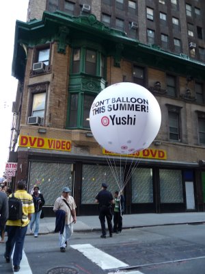 Today I saw the oddest advertisement for Yushi Bento Bar, a Japanese restaurant in New York. Floating down 8th Avenue was a balloon that read “Don’t Balloon this Summer! Yushi.” I believe they were trying to say something like, “Don’t get fat over summer, you disgusting pigs. Eat sushi at Yushi and stay lean.” But somehow, I’m not sure it got across.