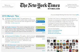 Last weekend, I took a long weekend trip to Vancouver, Canada to visit my friend, Dario. A week prior to the trip, I had no firm plans to go, but an interest in attending the 2010 Vancouver Olympics. Coincidentally, that week I had collaborated with a team of brilliant editors, producers and marketers in creating a Foursquare brand page for The New York Times. Phase 1 of the NY Times presence on Foursquare was sharing a list of Vancouver tips during the Olympics. Vancouver Foursquare players following The New York Times on Foursquare, had the opportunity to unlock the “NY Times Olympian” badge by checking into NY Times-recommended venues. As somewhat of a Foursquare fanatic, I was 95% sure that I NEEDED to go to Vancouver to get the first badge that my team created (Paul Lau, the badge designer, is stellar!).