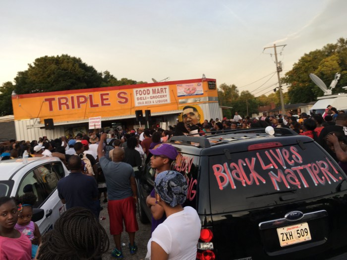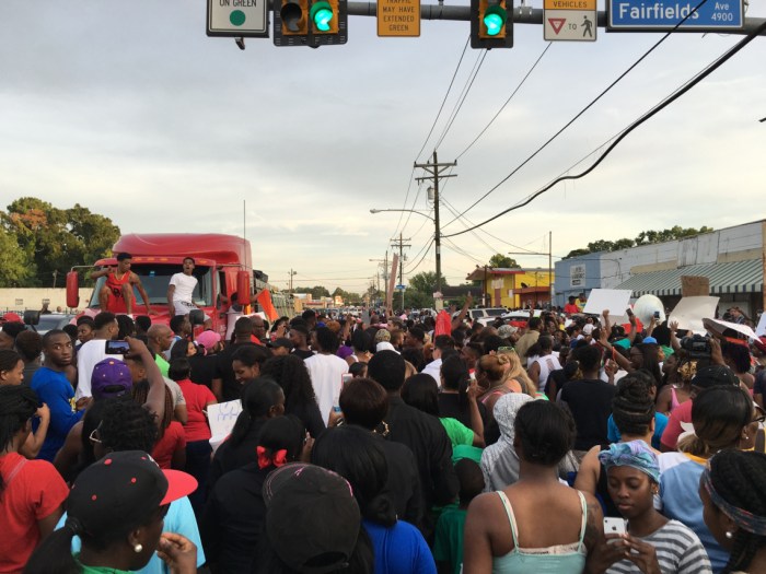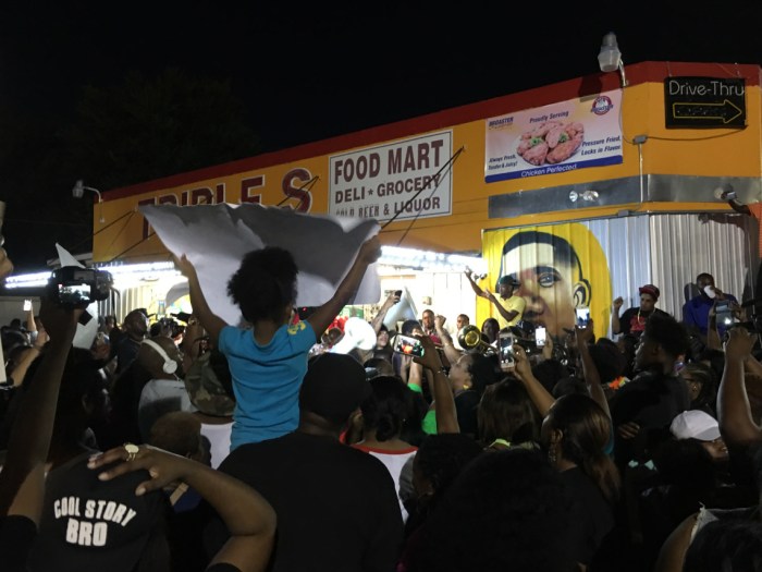 So, we gather in the streets to mourn and protest. I joined the Baton Rouge vigil for Alton Sterling last night at the Triple S Food Mart convenience store, where he was killed. The streets were filled in every direction for as long as the eye could see. Traffic came to a stop – cars honked and drivers chanted along with those gathered on the streets with signs and shirts that read of justice and resilience: “We shall overcome.” “Stop killing us.” “Fight power.” “We want justice.” “Black Lives Matter.” “Fly high, CD Man.”
