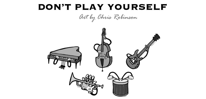 Say hello to DON’T PLAY YOURSELF, the first line by Overzealous Threads. The line features musical instruments playing themselves, GASP! I’m grateful for the creative talents of New England artist and musician Chris Robinson. I saw his rendition of the piano sketch below and the idea for this line hit me. I commissioned the snare drum, upright bass, trumpet, and electric guitar; and now we’ve got ourselves a full band. If only someone would have told them… you’re better served when you DON’T PLAY YOURSELF.