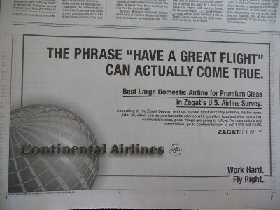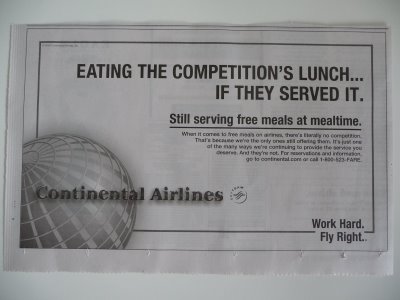 Above: A Continental Airlines ad in The New York Times Business section on Tuesday, April 21, 2009. (Size: 6 columns x 7 inches)