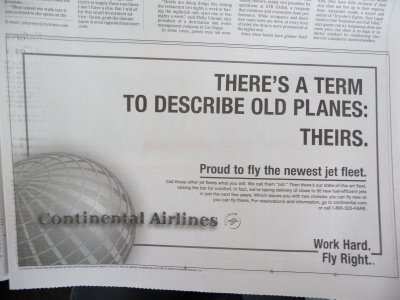 Above: A Continental Airlines ad in The New York Times Business section on Tuesday, March 31, 2009. (Size: 6 columns x 7 inches)