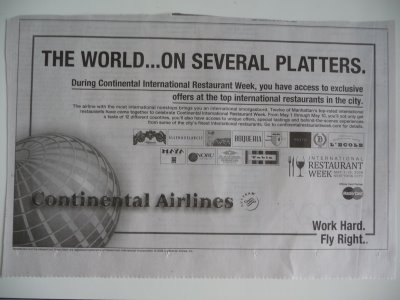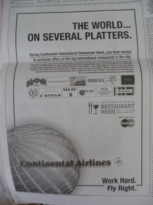 Above: A Continental Airlines ad honoring International Restaurant Week in The New York Times Dining section on Wednesday, April 15, 2009. (Size: 5 columns x 13.5 inches)