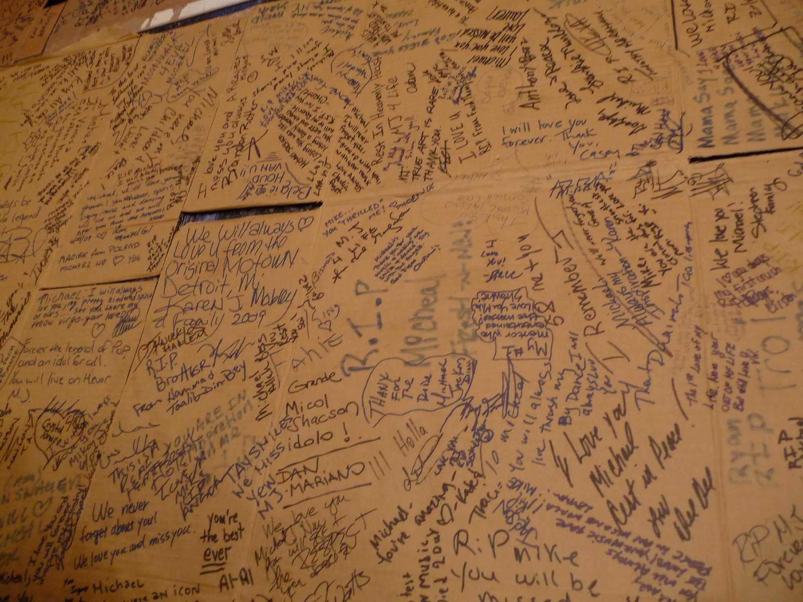 Above: Four cardboard boxes were taped in the entrance of the Apollo, where fans poured their hearts out to Jackson, leaving both notes of peace and love.