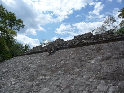 But back to Pok Ta Pok! The sport, as described to us by our tour guide (who called himself the Mayan George Clooney), was an ancient Mayan game that resembled basketball. Each team of seven players attempted to keep a ball off the ground using only their hips, knees, heads and elbows. The object was to get the ball over to a captain who was running along the sideline wall’s ledge (about 4-feet above the field). The captain then used a kind of stick to hit the ball through a stone ring located in the top-center of the stone wall on their team’s side. Interestingly, the ball weighed up to 9 pounds and was made from natural rubber and covered in animal hides. 9 pounds… That’s pretty crazy, considering that the average Mayan man was 5’2″ tall! But I guess what they lacked in height, they made up for in strength.
