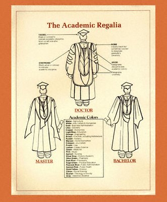 According to my favorite unofficial source, academic dress or academical dress is a traditional form of clothing for academic settings, primarily tertiary and sometimes secondary education, worn mainly by those that have been admitted to a university degree (or similar) or hold a status that entitles them to assume them (e.g. undergraduate students at certain old universities). It is also known as academicals and, in the United States, as academic regalia. I’d like to go with regalia, as I love sounding pretentious!